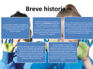 La Unidad Educativa Municipal Experimental Quitumbe ha implementado varios proyectos a lo largo de su historia para ofrecer una educación innovadora, incluyendo talleres musicales, artísticos, culturales y deportivos. Recientemente obtuvo la Certificación Internacional de Calidad ISO 9001:2000, garantizando procesos de alta calidad. Actualmente, la institución busca articular teoría con práctica y el presente con el futuro a través de nuevos proyectos.