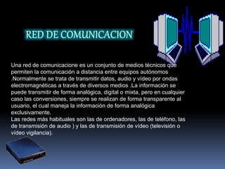 Una red de comunicaciones es un conjunto de medios técnicos que permiten la comunicación a distancia entre equipos a través de ondas electromagnéticas. Las redes más comunes son las de ordenadores, teléfonos, audio y video. Existen diferentes tipos de redes como LAN, PAN, WAN y MAN que se diferencian por su alcance geográfico y velocidad. Las topologías de red más comunes son la malla, estrella, árbol, bus y anillo que varían en la forma en que conectan los dispositivos.