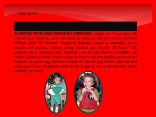Silvestre Francisco Dangond Corrales nació en 1980 en Urumita, La Guajira. Es hijo del cantante William José "El Palomo" Dangond Baquero y Dellys Corrales Rojas, quien le heredó su carisma y vocación musical. Está casado con Pieri Avendaño y tienen tres hijos. Ha lanzado varios álbumes que lo han consolidado como uno de los cantantes de vallenato más importantes de Colombia.