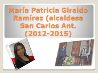 María Patricia Giraldo Ramírez fue la primera mujer alcaldesa de San Carlos Antioquia entre 2012 y 2015. Se ganó la confianza de los residentes cuando fue personera municipal entre 2008 y 2010 enfocándose en las necesidades de la comunidad. Gracias a su liderazgo, el municipio ha experimentado un crecimiento satisfactorio y desarrollo económico. También otorgó la primera fase de las instalaciones del Batallón Especial Energético y Vial No. 4, lo que ayudó a recobrar la confianza de la comunidad