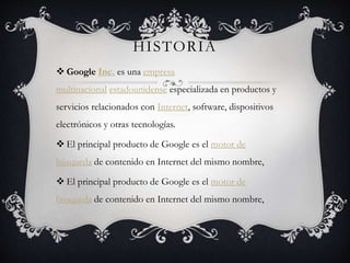 Google es una empresa multinacional estadounidense que ofrece una variedad de productos y servicios relacionados con Internet, incluyendo su motor de búsqueda principal, Gmail, Google Maps, YouTube, Chrome y Android; la compañía también está desarrollando proyectos como Google Fiber, Google Glass y vehículos autónomos. Con más de un millón de servidores en todo el mundo, Google procesa más de 1000 millones de búsquedas diarias y es el sitio web más visitado a nivel mundial.