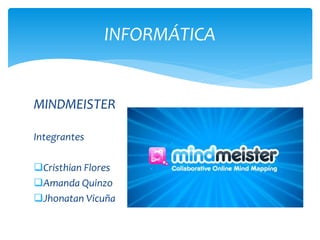 El documento presenta Mindmeister, una aplicación web para crear mapas mentales. Mindmeister permite crear mapas mentales de forma gratuita sin necesidad de instalación, solo se requiere acceso a Internet. La aplicación está disponible en varios idiomas incluyendo inglés y español. El documento proporciona instrucciones básicas sobre cómo crear un mapa mental en Mindmeister.