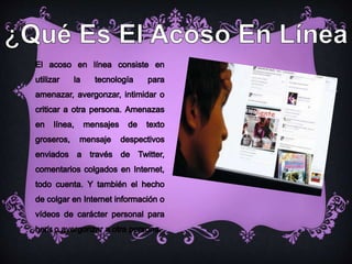El documento presenta definiciones de varios tipos de comportamientos dañinos: la denigración se refiere al trato humillante de un jefe a un empleado; la suplantación de identidad en línea implica engañar a usuarios para robar su información personal a través de correos electrónicos o sitios web falsos; el cyberstalking incluye acoso en línea como acusaciones falsas y amenazas; y el flaming se refiere a mensajes hostiles enviados en foros o listas de correo sin propósito constructivo.