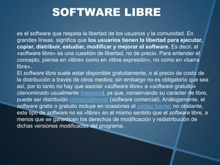 Un programa es software libre si otorga a los usuarios cuatro libertades esenciales: la libertad de ejecutar el programa para cualquier propósito, estudiar y modificar el código, redistribuir copias, y distribuir copias de versiones modificadas. De lo contrario, el programa no se considera software libre. El software libre ofrece ventajas como el escrutinio público que mejora la calidad y la independencia del proveedor, pero también puede presentar mayores costos de implementación e interoperabilidad.