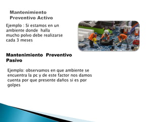 El documento describe diferentes tipos de mantenimiento de equipos, incluyendo mantenimiento preventivo pasivo que debe realizarse cada 3 meses si hay mucho polvo, mantenimiento correctivo no planeado cuando ocurren fallas imprevistas, mantenimiento correctivo programado para fallas no urgentes, y mantenimiento correctivo de emergencia para fallas críticas que no permiten reiniciar el equipo.