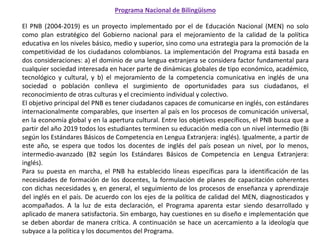 El Programa Nacional de Bilingüismo (PNB) de Colombia, implementado desde 2004, tiene como objetivo principal desarrollar la competencia comunicativa en inglés de los ciudadanos colombianos para que puedan competir a nivel global. El PNB busca que para 2019 todos los estudiantes terminen su educación media con un nivel intermedio de inglés y que todos los docentes posean al menos un nivel intermedio-avanzado. Para lograr esto, el PNB ha definido estándares de inglés, sistemas de evaluación y planes de capacitación para docentes, con