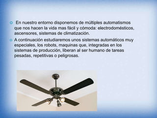 Este documento describe varios sistemas automáticos como termostatos, rociadores automáticos, botoneras de ascensores y ventiladores. También explica cómo funcionan los aires acondicionados y define qué es un robot, describiéndolos como máquinas programadas para realizar tareas de manera flexible y que imitan el comportamiento humano aunque no experimentan emociones reales.
