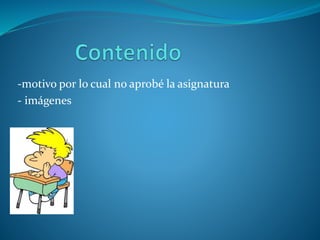 El estudiante no aprobó la asignatura debido a no presentar trabajos a tiempo y problemas con su computador. Reconoce que debe ser más responsable al presentar las cosas a tiempo y cumplir con sus compromisos para evitar tener problemas con los profesores o en su casa. En el futuro, planea esforzarse más para ser puntual, responsable y convertirse en un gran profesional.