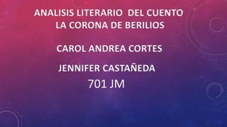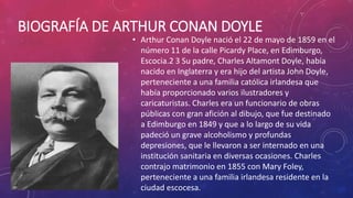 El documento resume la biografía de Arthur Conan Doyle y analiza el cuento "La Corona de Berilios". Resume la trama del cuento donde un banquero acude a Sherlock Holmes para que investigue sobre la corona de berilios robada de un cliente. Holmes deduce que la sobrina del banquero es la ladrona y que huyó con un estafador. Holmes encuentra los berilios faltantes y resuelve el caso.