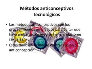 El documento describe diferentes métodos anticonceptivos, incluyendo métodos tecnológicos como dispositivos intrauterinos, métodos hormonales como pastillas y inyecciones, métodos definitivos como ligadura de trompas y vasectomía, y métodos de barrera como condones. Explica cómo funciona cada método y sus ventajas y desventajas. Recomienda buscar orientación médica para elegir el método más adecuado y usarlos correctamente para prevenir embarazos de manera segura y efectiva.