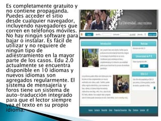 Edu 2.0 es un servicio gratuito en línea para administrar cursos que permite la realización de trabajos, exámenes y el cálculo de notas, además de ofrecer herramientas como chats, foros, wikis y blogs. Se trata de un sistema de gestión de cursos similar a Blackboard y Moodle que facilita la administración de cursos presenciales y en línea de manera gratuita y sin necesidad de software adicional.