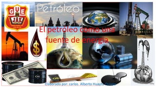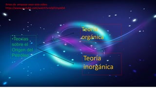 El documento habla sobre las teorías del origen del petróleo, incluyendo teorías inorgánicas como la del carburo y la del carbonato de calcio, y teorías orgánicas como la vegetal y la del carbón. También describe brevemente las propiedades físicas y químicas del petróleo, así como una breve historia de su uso en el mundo.