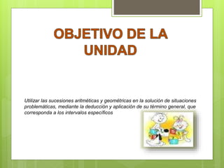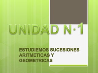 Este documento describe las sucesiones aritméticas y geométricas, incluyendo sus definiciones, términos generales y cómo usarlas para resolver problemas. Explica que una sucesión aritmética tiene una diferencia constante entre términos, mientras que una sucesión geométrica tiene una razón constante entre cada par de términos. También proporciona fórmulas para calcular sumas y términos individuales de ambos tipos de sucesiones.