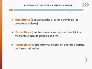 La energía solar se obtiene del sol y puede generar calor y electricidad. Existen tres formas principales de obtenerla: fototérmica mediante colectores solares, fotovoltaica usando paneles solares, y termoeléctrica convirtiendo el calor solar en energía eléctrica indirectamente.
