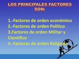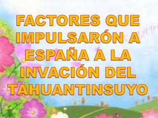 El documento resume las principales ambiciones y objetivos de España en la conquista de América: 1) Enriquecerse con metales preciosos como el oro y la plata de las colonias, 2) Convertirse en la principal potencia de Europa aprovechando las riquezas de sus colonias, y 3) Difundir la religión católica y convertir a los indígenas. España también creía en su superioridad militar sobre los naturales debido a armas más avanzadas como culebrinas, espadas y arcabuces, así como su poderosa caballería.