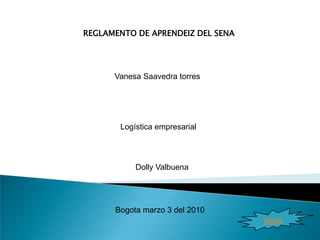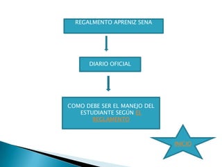 Este documento presenta el reglamento de aprendices del SENA, el cual establece los derechos, deberes, prohibiciones y procesos que rigen a los aprendices. El reglamento contiene 12 capítulos que cubren temas como el campo de aplicación, derechos de los aprendices, deberes, prohibiciones, etapa de práctica, trámites académicos, proceso de formación e incumplimiento, faltas académicas y disciplinarias, medidas y procedimientos. El objetivo es proveer