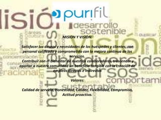 Este documento presenta la propuesta de Purifil Internacional, una empresa colombiana que fabrica y comercializa sistemas de purificación de agua y aire a base de ozono, para hoteles y otros establecimientos. El ozono es efectivo para desinfectar, eliminar malos olores y mejorar la oxigenación. Purifil sugiere el uso de sus sistemas de ozonización en las habitaciones de hoteles para desinfectar colchones, cortinas y otras superficies y así prevenir la transmisión de enfermedades y alerg