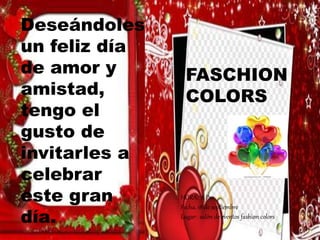 Se invita a celebrar el día del amor y la amistad en el salón de eventos Fashion Colors el 18 de septiembre a las 8 pm.