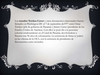 El Tratado Torrijos-Carter y otros documentos relacionados fueron firmados el 7 de septiembre de 1977 entre Omar Torrijos de Panamá y Jimmy Carter de los Estados Unidos. Estos tratados pusieron fin a la presencia colonial estadounidense en el Canal de Panamá después de 96 años, devolviendo el control a Panamá. Los tratados, que fueron ratificados por Panamá y aprobados por el Senado de los Estados Unidos, comprometieron a ambos países a administrar, operar y mantener cooperativamente el canal de Panam