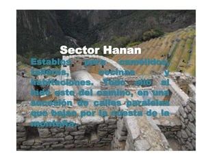 Machu Picchu es un antiguo poblado inca construido en el siglo XV en las montañas Machu Picchu y Huayna Picchu en Perú. Estaba dividido en sectores como el Sector Hanan con establos y talleres, y el Templo del Sol usado para ceremonias relacionadas con el solsticio de junio. Otros lugares importantes incluyen la Residencia Real, la Plaza Sagrada para rituales, y la Intihuatana con terrazas en forma de pirámide.