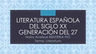 Federico García Lorca fue uno de los más grandes representantes de la Generación del 27. Nació en 1898 en Granada y estudió derecho, filosofía y letras en la universidad de Granada. Escribió importantes obras de teatro como La casa de Bernarda Alba, Bodas de sangre y Yerma que lo convirtieron en uno de los dramaturgos más importantes de España. Lorca fue asesinado en 1936 al inicio de la Guerra Civil Española.