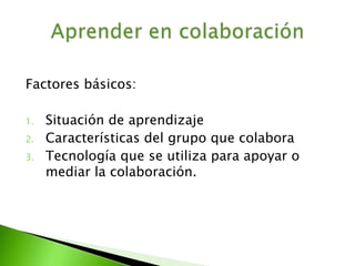 Este documento describe factores clave para el aprendizaje colaborativo como la situación de aprendizaje, las características del grupo y la tecnología utilizada. También discute tareas como debates virtuales y aprendizaje basado en problemas que permiten la construcción colaborativa de conocimiento. Finalmente, destaca la importancia de crear comunidades de aprendices y usar herramientas de evaluación grupal.