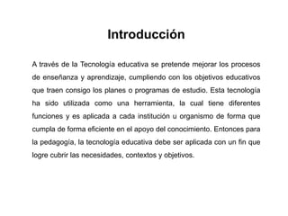 Este documento presenta un resumen de la tecnología educativa. Explica que surgió en los años 40 y se desarrolló como campo de estudio en los 50 y 60, con el objetivo de mejorar la enseñanza y el aprendizaje mediante recursos de comunicación. En los 70 se crearon asociaciones profesionales sobre el tema. En el siglo XXI, la tecnología educativa se reformuló debido a nuevos paradigmas sociales y las TIC. El documento también describe cómo la tecnología educativa se relaciona con objetivos,