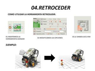 El documento describe tres herramientas: Avanzar, Retroceder y Acelerar. Para usar cada una, se inserta la herramienta, se modifican sus opciones y luego se reproduce o ejecuta. Se provee un ejemplo para ilustrar el uso de cada herramienta.