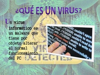 Un virus informático es un programa malicioso que puede alterar el funcionamiento normal de una computadora. El primer virus conocido fue Creeper, creado en 1972, el cual mostraba un mensaje en la pantalla. Los virus se propagan cuando pasan de una computadora a otra a través de discos, pendrives, redes u otros medios y luego se replican e infectan otros archivos. Para prevenir infecciones, es importante mantener software antivirus actualizado y no abrir archivos adjuntos de fuentes desconocidas.