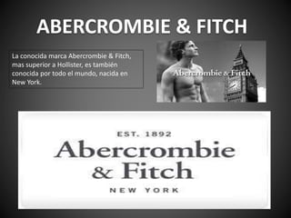 El documento compara dos marcas de ropa populares entre adolescentes, Hollister California y Abercrombie & Fitch. Hollister es una marca nacida en California que causa furor, mientras que Abercrombie & Fitch, nacida en Nueva York, es considerada superior pero también conocida en todo el mundo.