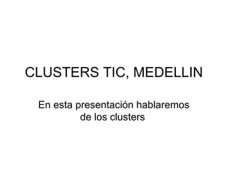 Este documento habla sobre los clusters estratégicos de Medellín, en particular el cluster TIC. Explica que Medellín ha adoptado una estrategia de ciudad cluster con cinco clusters iniciales, incluido el cluster TIC. Describe las misiones, visiones y participantes clave del cluster TIC, cuyo objetivo es generar crecimiento rentable y sostenible en la industria TIC de Medellín a través de la colaboración entre empresas e instituciones del sector.