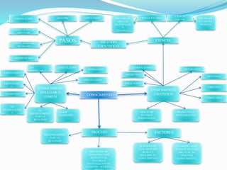 Este mapa conceptual resume los principales conceptos relacionados con la ciencia. Describe el método científico, incluyendo la observación, formulación del problema, formulación de hipótesis, análisis, experimentación y verificación. Distingue entre conocimiento científico y conocimiento común, señalando que el conocimiento científico es sistemático, objetivo, verificable y generalizable.