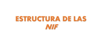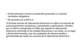 Las NIF son un conjunto de pronunciamientos normativos, conceptuales y particulares emitidos por el CINIF que regulan la información financiera contenida en los estados financieros y sus notas. La contabilidad financiera permite medir, evaluar y seguir el progreso financiero de las entidades a través de informes como los estados financieros, los cuales pueden usarse para tomar decisiones si son útiles y confiables. La contabilidad incluye diferentes ramas como la financiera, administrativa, de costos, fiscal y gubernamental.