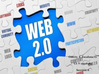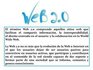 El documento describe la Web 2.0 y algunas de sus características principales como facilitar el compartir información entre usuarios, la interoperabilidad y la colaboración. Explica que la Web 2.0 evolucionó para convertir a los usuarios de pasivos a activos, permitiéndoles contribuir y generar contenido. También resume brevemente algunas de las aplicaciones y sitios web más populares asociados con la Web 2.0 como blogs, redes sociales, wikis, Facebook, Google, YouTube, Twitter y Wikipedia.