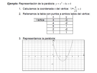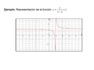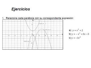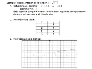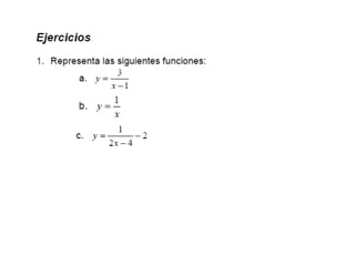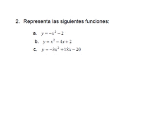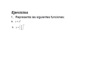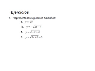 Este documento resume diferentes tipos de funciones elementales, incluyendo funciones afines, cuadráticas, de proporcionalidad inversa, radicales, exponenciales y logarítmicas. Define funciones afines como rectas de la forma y = mx + n, donde m es la pendiente y n es la ordenada en el origen. Explica que si m es positivo la función es creciente, y si m es negativo es decreciente.