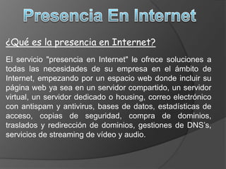 Este documento describe la importancia de tener una presencia en Internet para las empresas. Explica que la presencia en Internet ofrece soluciones como páginas web, correo electrónico, bases de datos y más. También destaca que Internet es un medio económico para interactuar con clientes, ofrecer servicios, mejorar el posicionamiento y reducir costos de marketing. Finalmente, resalta estadísticas sobre el crecimiento del comercio electrónico en México y las principales actividades que realizan los usuarios en Internet.