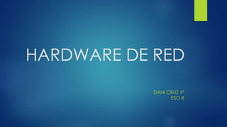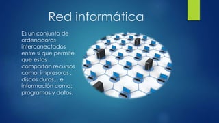 El documento describe los principales componentes de hardware de red. Estos incluyen adaptadores de red, cables, concentradores, conmutadores, puentes, enrutadores y puntos de acceso inalámbricos. Cada uno juega un papel diferente en conectar dispositivos de red y facilitar el intercambio de información entre ellos.