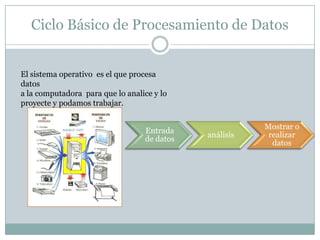 El documento describe el ciclo básico de procesamiento de datos, incluyendo la entrada, proceso y salida de datos. Explica que la entrada incluye dispositivos como el teclado y lectores que introducen datos al sistema, mientras que la salida incluye impresoras y monitores que extraen la información, y el proceso lo lleva a cabo el microprocesador.