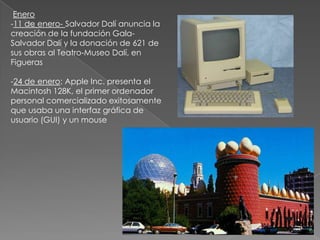 En 1984, Salvador Dalí donó más de 600 obras al Teatro-Museo Dalí en Figueras y Apple lanzó el exitoso Macintosh de 128K con interfaz gráfica. En España, se celebraron manifestaciones a favor de la libertad de enseñanza y contra la ley educativa socialista, y se descubrió un agujero de 40.000 millones de pesetas en el fondo de pensiones de Telefónica. Finalmente, en diciembre ocurrió la catástrofe de Bhopal en India, donde gases tóxicos mataron a 8.