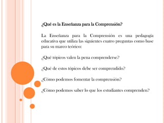 El documento presenta preguntas que un docente puede hacerse para introducirse al marco de la Enseñanza para la Comprensión. Luego, describe las principales partes de dicho marco: los Tópicos Generativos, las Metas de Comprensión, los Desempeños de Comprensión y la Valoración Continua.