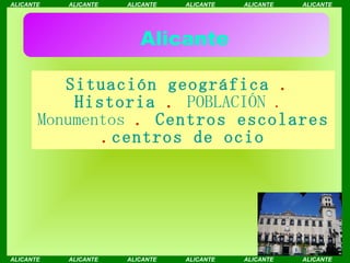 Este documento proporciona información sobre la ciudad de Alicante, España. Presenta su situación geográfica, historia, población, monumentos principales y algunos centros educativos y de ocio. La ciudad tiene más de 3,000 años de historia y actualmente tiene alrededor de 310,000 habitantes. Entre sus monumentos más destacados se encuentra la Fuente de los Luceros. La ciudad también cuenta con varios institutos de educación secundaria y centros deportivos y culturales.