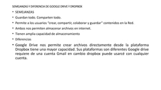 Google Drive y Dropbox permiten a los usuarios almacenar y compartir archivos en línea, pero tienen algunas diferencias clave. Google Drive permite crear archivos directamente en la plataforma y requiere una cuenta de Gmail, mientras que Dropbox tiene una mayor capacidad de almacenamiento y se puede usar con cualquier cuenta de correo electrónico. Ambos servicios comparten la capacidad de crear, compartir y colaborar en contenido en línea.