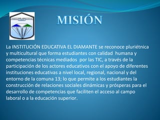 El documento describe la Institución Educativa El Diamante, la cual se reconoce como una institución pluriétnica y multicultural que forma estudiantes con calidad humana y competencias técnicas mediante el uso de las tecnologías de la información y la comunicación (TIC). La institución busca ser reconocida en 2017 como un modelo de excelencia en educación media técnica apoyado por las TIC en la comuna 13 de Santiago de Cali. El documento también identifica fortalezas, debilidades, oportunidades y amenazas de la institución en