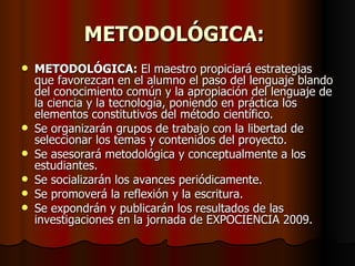 El maestro promoverá estrategias que ayuden a los estudiantes a adoptar el lenguaje científico, implementando el método científico. Los estudiantes trabajarán en grupos para seleccionar temas de proyectos y recibirán asesoramiento metodológico y conceptual. Compartirán periódicamente avances y resultados de investigaciones.