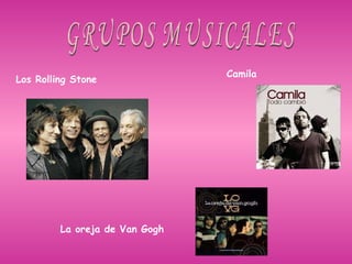 Los principales grupos y solistas mencionados en el documento incluyen The Rolling Stones, La oreja de Van Gogh, The Jackson 5, Alejandro Sanz, Leona Lewis, Whitney Houston, Mariah Carey, Justin Timberlake, Aretha Franklin, Macaco y Malú.