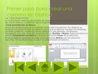El documento describe diferentes formas de crear y administrar presentaciones en PowerPoint, incluyendo: 1) crear una presentación en blanco o a partir de una plantilla, 2) guardar y abrir presentaciones, 3) cambiar entre vistas como Normal, Clasificador y Presentación, y 4) usar zoom para acercar o alejar diapositivas.