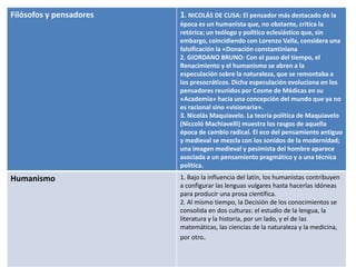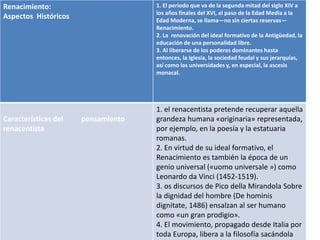 El Renacimiento se refiere al período entre la segunda mitad del siglo XIV y finales del siglo XVI, cuando se produjo el paso de la Edad Media a la Edad Moderna. Se caracterizó por la renovación del ideal de la Antigüedad clásica y la educación de una personalidad libre, al liberarse de las instituciones dominantes de la época como la Iglesia y la sociedad feudal. Los pensadores renacentistas buscaban recuperar la grandeza humana representada en el arte y la literatura romana, y promovían la idea del "hombre