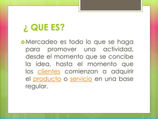 El documento habla sobre el concepto de mercadeo. Explica que el mercadeo incluye todas las actividades para promover un producto o servicio desde su concepción hasta que los clientes lo compran regularmente. También destaca que el mercadeo es importante para cualquier negocio ya que es necesario para tener éxito. Finalmente, define los conceptos básicos de oferta y demanda que son fundamentales para el mercadeo.