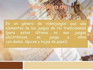 Un RPG es un género de videojuego donde el jugador controla un personaje en un mundo imaginario, enfrentando misiones y combates. Los RPG tienen elementos como niveles de personaje, sistemas de combate y una historia. Existen varios estilos como RPG de acción en tiempo real o tácticos por turnos, y también RPG multijugador masivos en línea.