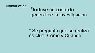 Este documento describe los componentes clave de un proyecto de investigación. Estos incluyen una introducción que establece el contexto y las preguntas de investigación, una justificación, objetivos generales y específicos, un marco teórico, una metodología, resultados y análisis, conclusiones, recomendaciones, bibliografía y anexos. Cada sección cumple un propósito específico para definir, guiar y comunicar efectivamente el proyecto de investigación.